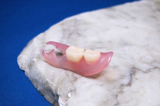 「部分入れ歯」は取り外し式の歯を失った部分に装着する入れ歯で、残っている歯にバネをかけて固定します。